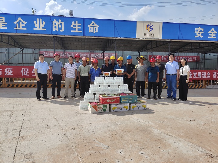 7月21上午,业主单位黄山市城投集团党委书记、董事长陈杰、总裁黄世稳等一行分组带队到我公司承建的黄山市危险(含医疗)废物集中处置中心易地重建工程、黄山市南部城镇群水务调度中心项目、黄山生猪定点屠宰加工及配套设施项目及配套冷链项目施工现场送来了人丹、十滴水、矿泉水、西瓜等防暑降温用品,并向奋战在一线的施工人员及项目部管理人员表示了亲切的慰问和感谢,对一线人员头顶烈日不畏酷暑的精神给予了赞扬。