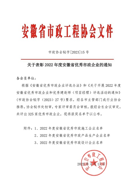 股份有限公司被安徽省市政协会评为“2022年度安徽省优秀市政企业”。该项荣誉是由各市主管部门或行业协会推荐,经省市政协会秘书处初审,专家评审委员会审核,安徽省市政工程协会最终审定。