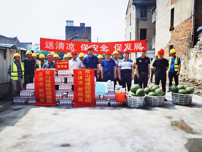 烈日炎炎,气温居高不下。为保障项目职工安全健康权益,确保项目安全生产平稳推进,8月10日上午,黄山城投城建控股有限公司总经理汪国文等一行赴宁国市河沥文化街区EPC项目工地开展走访调研暨“夏送清凉”慰问活动。leyu.乐鱼(中国)体育科技股份有限公司官网 股份有限公司董事长项端阳、总经理叶金发、副总经理吴学武陪同调研慰问。