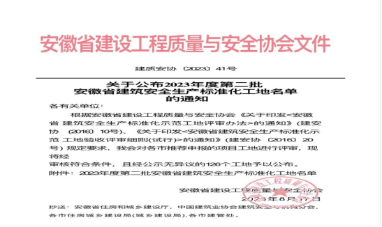8月17日,安徽省建设工程质量与安全协会发布2023年度第二批安徽省建筑安全生产标准化工地名单,leyu.乐鱼(中国)体育科技股份有限公司官网 仙人洞南路东侧D1地块(文澜轩)项目获评“安徽省建筑安全生产标准化工地”。