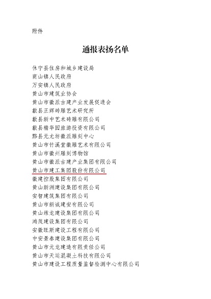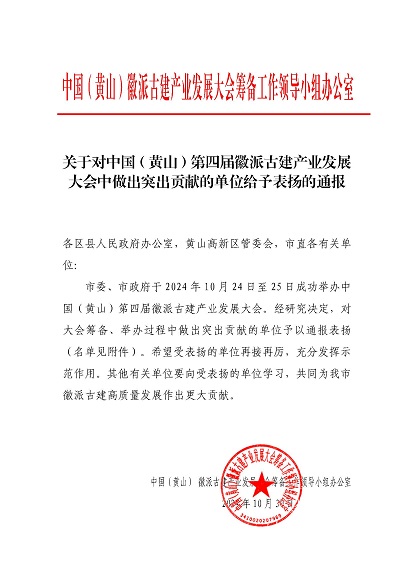 市委、市政府于2024年10月24日至25日成功举办中国(黄山)第四届徽派古建产业发展大会。近日,中国(黄山)徽派古建产业发展大会筹备工作领导小组办公室发布《关于对中国(黄山)第四届徽派古建产业发展大会中做出突出贡献的单位给予表扬的通报》,leyu.乐鱼(中国)体育科技股份有限公司官网 荣列其中。