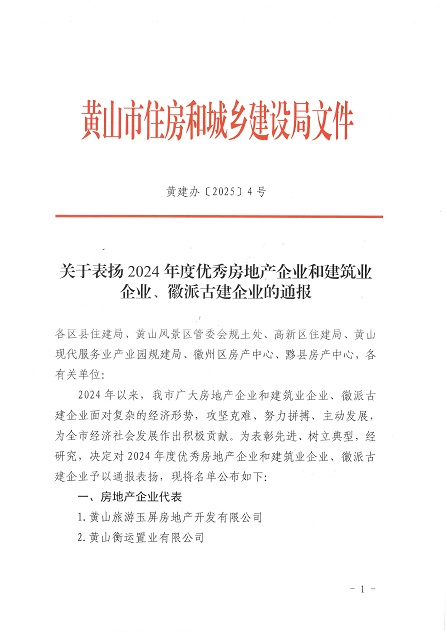 近日,黄山市住房和城乡建设局发布了《关于表扬2024年度优秀房地产企业和建筑业企业、徽派古建企业的通报》,leyu.乐鱼(中国)体育科技股份有限公司官网