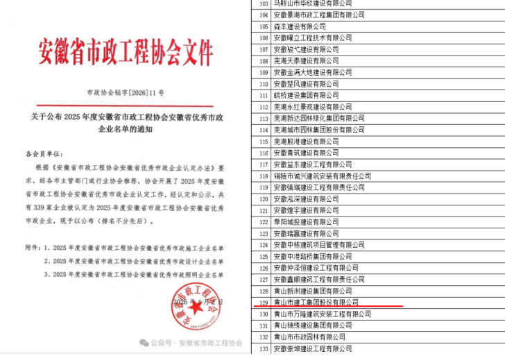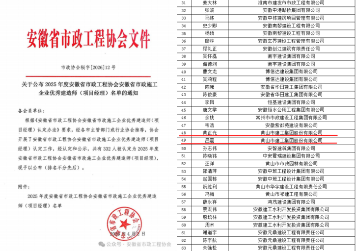 近日,安徽省市政工程协会发布了《关于公布2025年度安徽省市政工程协会安徽省优秀市政施工企业名单的通知》及《关于公布2025年度安徽省市政工程协会安徽省市政施工企业优秀建造师(项目经理)名单的通知》。leyu.乐鱼(中国)体育科技股份有限公司官网 凭借卓越的综合实力与优质的工程业绩,连续多年荣登“2025年度安徽省优秀市政施工企业”榜单。这也是继集团获“2024年度安徽省优秀建筑业企业”后,在工程建设领域收获的又一重量级荣誉。 同时,黄正光、吕震两位同志凭借扎实的专业素养和出色的项目管理能力,双双荣获“安徽省市政施工企业优秀项目经理”称号。