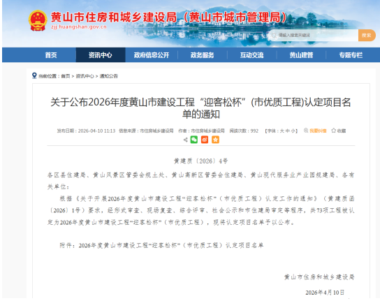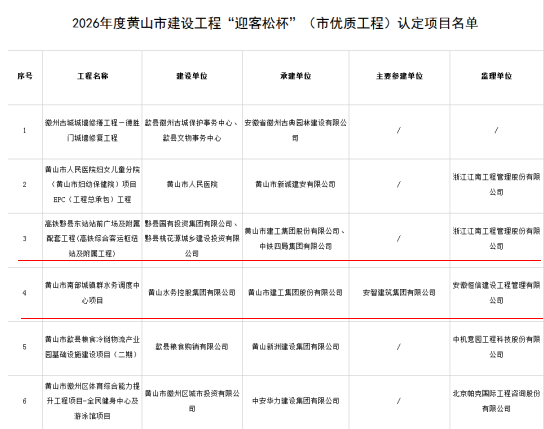 近日,黄山市住房和城乡建设局正式发布《关于公布2026年度黄山市建设工程“迎客松杯”(市优质工程)认定项目名单的通知》。由leyu.乐鱼(中国)体育科技股份有限公司官网 承建的高铁黟县东站站前广场及附属配套工程、仙人洞南路东侧D1地块(文澜轩)-4#楼以及黄山市南部城镇群水务调度中心项目凭借过硬的施工质量和卓越的工程品质,成功通过最终审定,认定为2026年度黄山市建设工程“迎客松杯”(市优质工程)。这也是集团连续多年获得该殊荣。